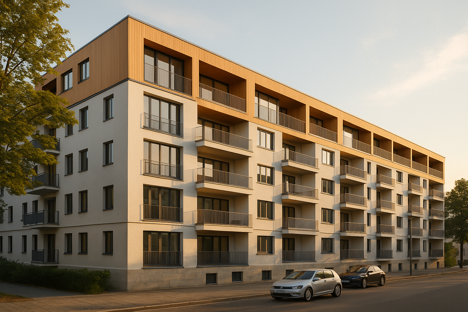 Serieller Holzbau ist die ideale Bauweise für Aufstockungen in der Stadt. Kein anderes System verbindet Nachhaltigkeit, Präzision und Tempo so konsequent – mit minimaler Belastung für Mieter:innen und maximalem architektonischem Spielraum.